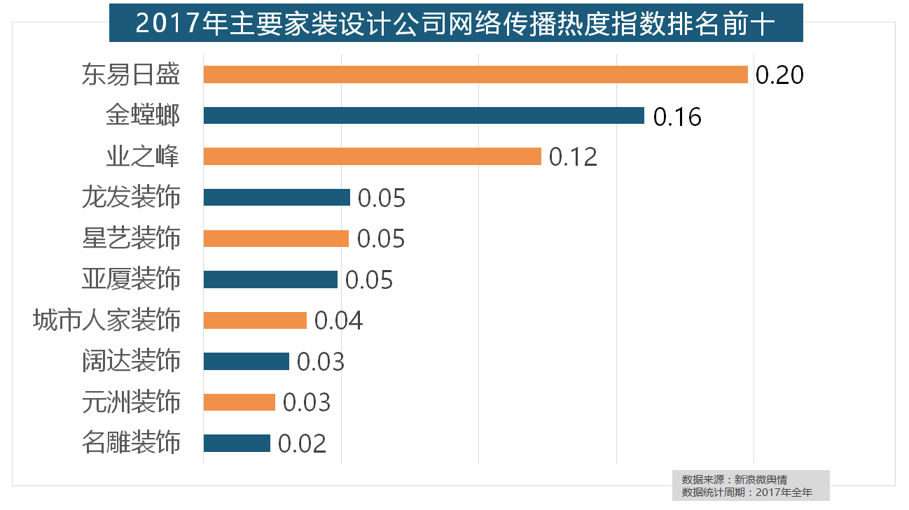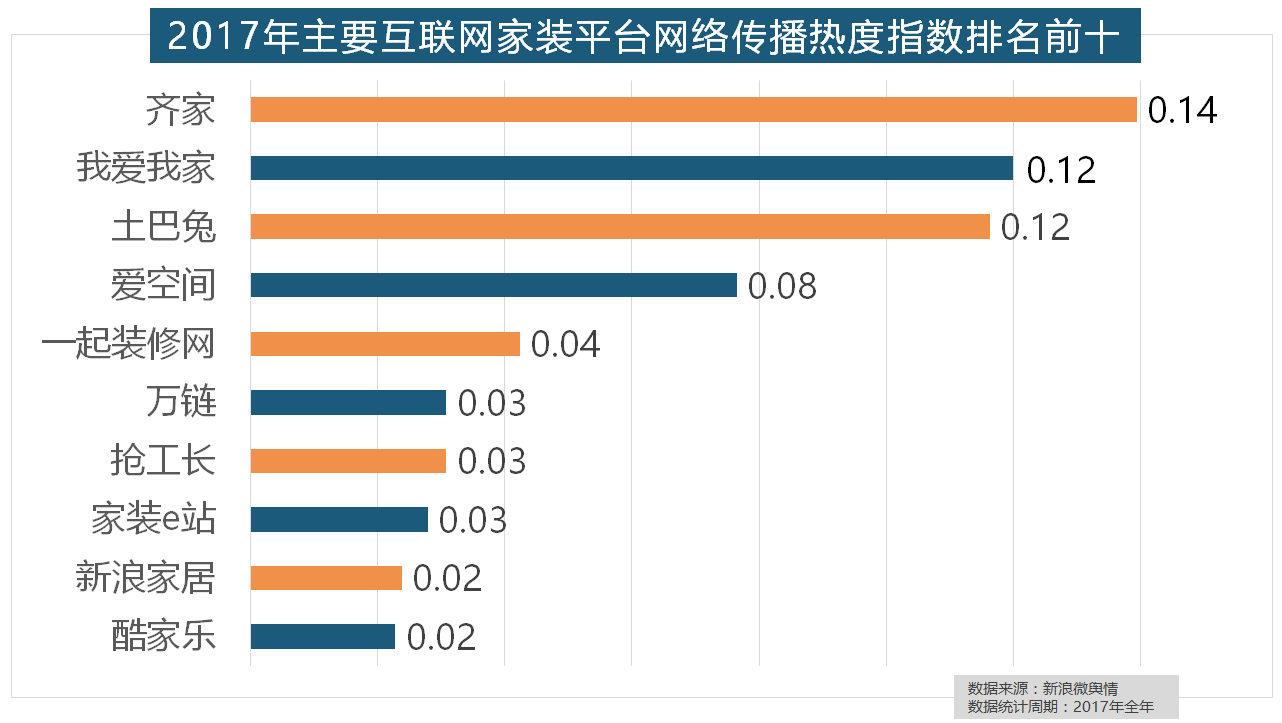 据新浪微舆情对2017年我国次要家拆设想公司大数据阐发显示,据新浪微舆情大数据阐发显示,立邦、三棵树、多乐士的收集热度指数最高,2017年,一众互联网家拆平台也前来分一杯羹。